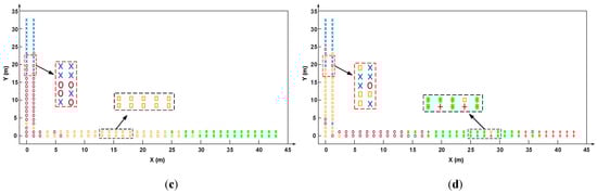 The clustering result comparison between the proposed PL-assisted clustering algorithm and the k-means algorithm. (a) The clustering result of the proposed algorithm in experimental field 1, the number of clusters is 8; (b) the clustering result of the k-means algorithm in experimental field 1, the number of clusters is 7; (c) the clustering result of the proposed algorithm in experimental field 2, the number of clusters is 4; and (d) the clustering result of the k-means algorithm in experimental field 2, the number of clusters is 5.