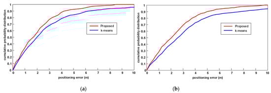 Now we evaluate the effect of the different clustering algorithms on positioning accuracy. We select 120 points and 100 points as the TPs in experimental field 1 and experimental field 2, respectively. For convenience, we use the Euclidean-WKNN algorithm for the position estimation in this experiment and compare the positioning accuracy in terms of cumulative probability distribution. As shown in Figure 7, because of the reduction of those RPs in the cluster whose positions are far apart, the positioning error with the proposed PL-assisted clustering algorithm is smaller. It can also be concluded that better clustering results can produce better positioning performance.