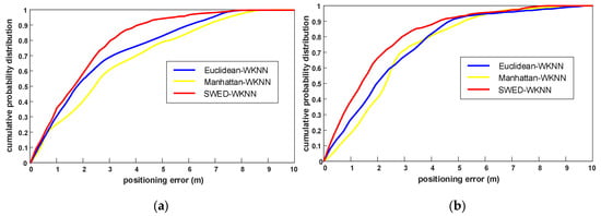 The comparison of cumulative probability distributions of the positioning errors of the traditional Euclidean-WKNN and Manhattan-WKNN, and the proposed SWED-WKNN. (a) The cumulative probability distributions of the positioning errors in experimental field 1; and (b) the cumulative probability distributions of the positioning errors in experimental field 2.