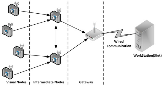 A VSN platform primarily consists of hardware and software components. The hardware component includes the camera, processing unit, and transmission module that work together to create a visual node that is capable of capturing and sending the data to the workstation for further processing. Whereas the software component includes image acquisition, encoding process, and communication protocol that helps to compress and packetize the data before transmission. As shown in Figure 1 is an example of how devices in VSN are typically connected. The development of the platform also aims to create a simple, flexible, and low-cost VSN platform integrated with energy efficient compression.