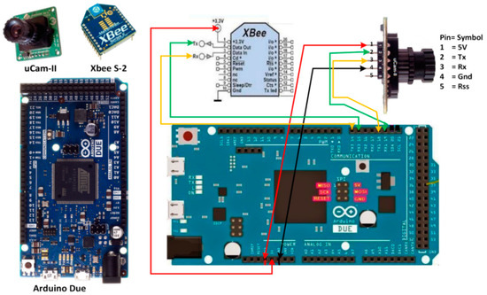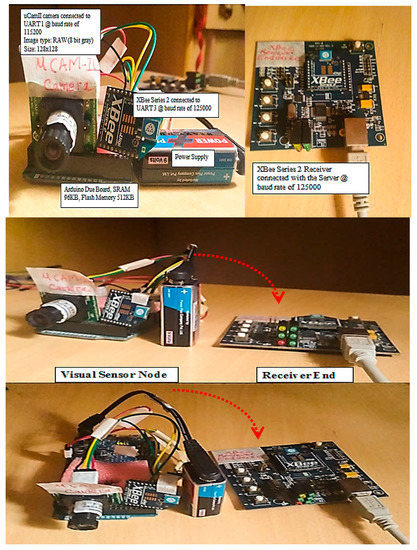 As shown in Figure 2, a visual node that consists of an Arduino Due board [28], a CMOS uCAM-II camera [29], and an XBee transmission module [30].