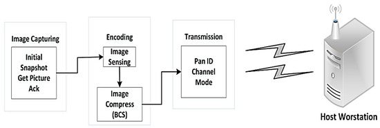 The image obtained from uCAM-II is first stored into the flash memory. The BCS is applied to encode the image on a block-by-block basis. The encoding process can be divided into two parts, namely image sensing, and image compression as shown in Figure 6.