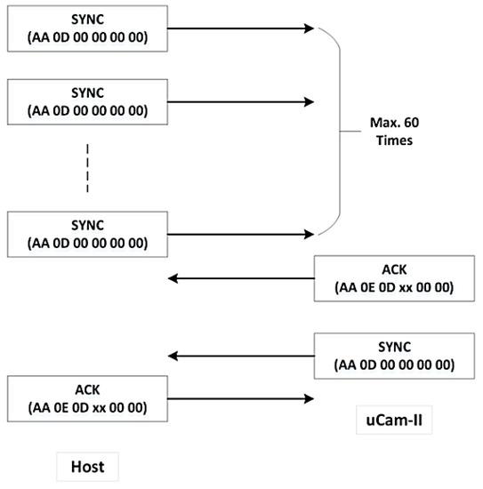 To start the communication process, a connection between the host and the uCAM-II must be established. As shown in Figure 4, this is started by synchronizing the host with the uCAM-II via SYNC command. The SYNC command is sent periodically to awake the camera from sleep state if no commands have been sent. If communications are occurring between the host and the camera, the camera will stay awake. The host sends the SYNC command continuously until an acknowledgment (ACK) and SYNC command is received from the uCAM-II. A maximum of 60 SYNC command can be sent to awake the module. If the module does not respond after 60 SYNC commands, it is restarted, and the same actions are performed again. Usually, up to 25 to 60 SYNC commands may be necessary before the module will respond. After the host receives the response, it should reply with the ACK command to confirm the synchronization process.
