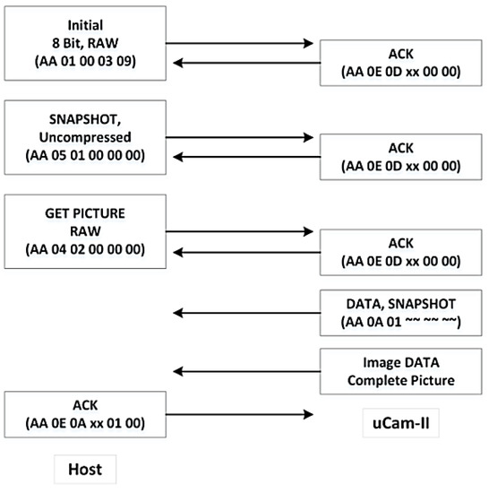 After the communication link is established, uCAM-II is ready to capture images. In order to capture a raw image, the following commands have to be sent from the host to the uCAM-II.