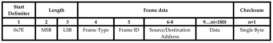 Two Series-2 XBee modules are used. One is connected to the Arduino Due, and the other is connected to the server. The former is configured as the end device that is in charge of sending data, whereas the latter is configured as a coordinator that is in charge of setting up the network and receiving data. It is also necessary to ensure that they are operating under the same PAN ID and channel number. All these parameters have to be configured before forming a wireless network. The API mode is used over AT mode to emulate the transmission pattern of a VSN. The API mode is designed to transmit highly structured data in a fast, predictable, and reliable way. The XBee modules were configured in API mode, having a baud rate of 125,000, data bits of 8, no parity bits, and 1 stop bit. In API mode, the input data will be packetized into many API frames before transmit within the wireless network. The API frame structure is shown in Figure 7 [37].