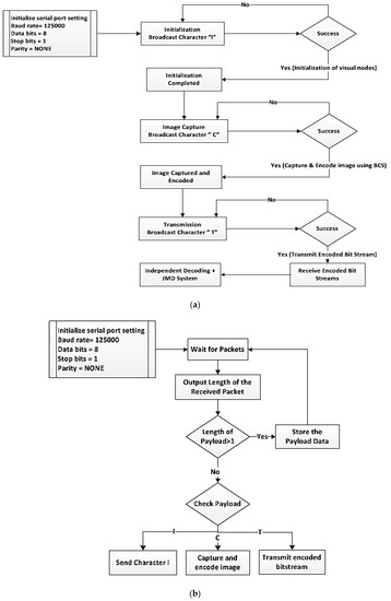 - Once the initialization is completed, the coordinator will broadcast the next signal containing a ‘C’ character. The ‘C’ character will update the visual nodes to capture and encode the image data with the BCS scheme.