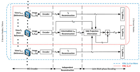 BCS-JMD-TV [17,18] is a multi-view compression scheme for VSN based on block-based compressive sensing (BCS) and joint multi-phase decoding (JMD). First, images captured by different visual nodes are encoded using BCS to reduce the hardware complexity. The block-based approach simplifies the implementation and storage of the visual node and provides significantly faster reconstruction. One of the visual nodes is configured to serve as the reference node, whereas the others serve as non-reference nodes. In this case, images captured by the non-reference nodes are encoded at a lower subrate when compared with the images from the reference nodes. The core idea is to improve the reconstruction of images captured by the non-reference nodes, by using information in the image captured by the reference node. It is achieved by exploiting the high correlation between them at the joint-decoder. The encoded measurements are then transmitted independently to the server that serves at the joint-decoder.
