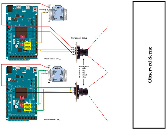 In order to simplify the evaluation process, two visual nodes are deployed in a horizontal setup, and each visual sensor is separated by a specific distance from its neighbor as shown in Figure 10.