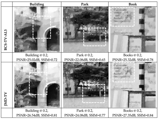 Some samples of the reconstructed images are shown in Figure 13. By comparing the highlighted regions (white dotted boxes), it is noticed that the JMD-TV reduces the blurring effect present in the images reconstructed using BSC-TV-AL3, and the reconstructed image looks much sharper.
