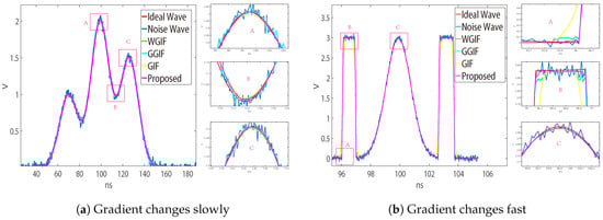 It can be seen in Section 3 that WGIF and GIF had a good filtering effect on waveforms with a small gradient, and they can maintain edge features well at the same time, but the edge protection effect was poor in waveforms with a large gradient.