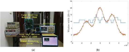 We studied the influence of the noise on filter parameters through a large number of data simulations. Experiments on land and simulation under water were carried out to verify the effectiveness of the algorithm. As shown in Figure 3a, all measured data in this paper were obtained by the LADAR system, which used an 8 × 8 array APDas the detector and a 1064-nm pulsed laser as the detection source to realize target distance detection based on the time-of-flight method. The system uses a multi-channel preamplifier circuit based on the variable gain amplifier (VGA) and implements full waveform sampling analysis based on a 2-GHz sampling rate ADC.