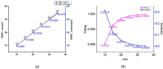 As shown in Figure 4a, the maximum deviation of estimation was 1.2%, while the SNR was in the range of 0–35. When the SNR is low, the eigenvalue of noise in signal matrix is large, which can be extracted more accurately, and the estimation is better. In Figure 4b, it can be seen that a good noise suppression effect can be achieved, and the fittings were more than 99% at different SNRs.