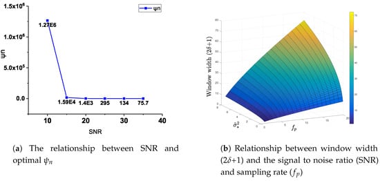 The relationship between , window width (2+1), , and SNR. (a) The relationship between SNR, optimal in AGGF. (b) Relationship between window width (2+1), noise level (), and sampling rate () in AGGF.
