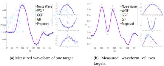 Measured waveform noise suppression effect. (a) Comparison of noise suppression effect of one target. (b) Comparison of noise suppression effect of two targets.