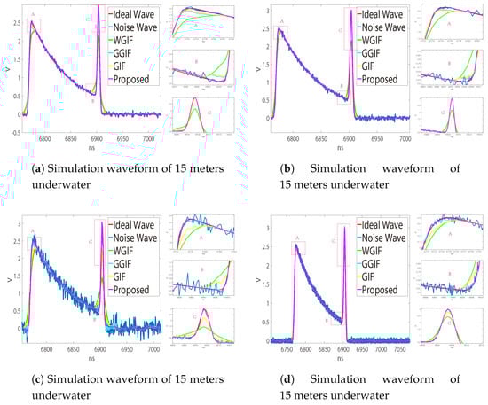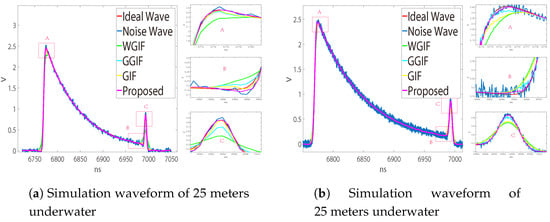 Figure 6a,b is the waveforms measured by the LADAR system on land, in which (a) is about one object and (b) is the waveform measured by two objects 30 cm apart. Since there was no obvious gradient change, the noise suppression effect of GGIF was poor, and the effect of the other algorithms was similar. Figure 7 and Figure 8 show the underwater waveforms simulated at 15 m and 25 m, respectively. The two echoes before and after were the surface signal and underwater signal, separately. Because the light beam reflected continuously in the water, the first echo had trailing.