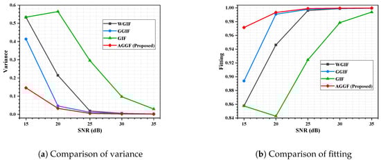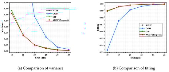 Table 1 shows the comparison of the filtering effects of these algorithms with different sensitivities at different SNR. The optimal sensitivity of WGIF, GGIF, AGGF, and GIF were approximately equal at the same SNR, and this can be obtained by comparing Equations (2) and (7). In other words, all of them optimized the edge filtering effect by weighting the .