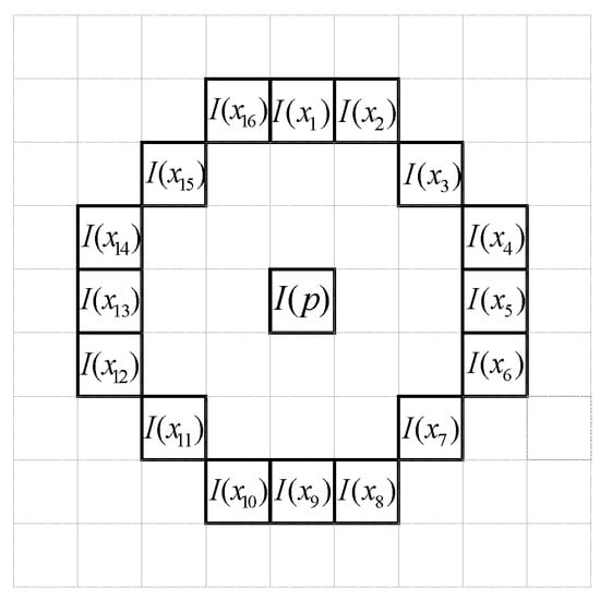 - The AGAST feature detection method is applied to the image, and the number of identified feature points is determined aswhere is the grayscale value of a random point on the circumference of the circle as shown in Figure 3. The variable is the center’s gray scale value. The variables and represent the threshold of the grayscale value and the total number of circles, respectively. The parameters, and , are the location of potential corner points in the image and OR operation, respectively. Assuming that two consecutive 3/4 of the or values are greater or smaller than the threshold, is then confirmed as a corner feature in the target image. Thus, denotes the number of feature points. In addition, the AGAST feature detection method has speeded up the FAST algorithm on the accelerated segment test.