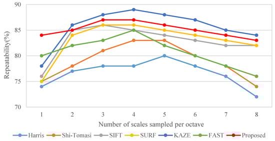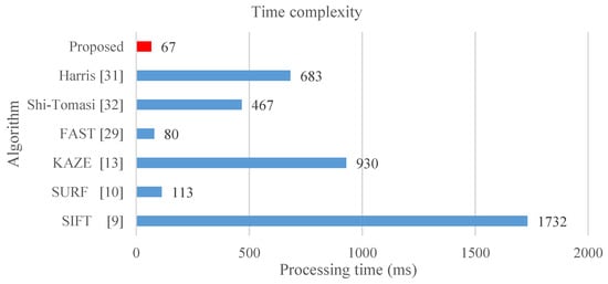 Figure 4 presents the effects of the MAGAST, which is applied to a scale space that is established through the two-octave capturing technique and the other detection algorithms, including SIFT, SURF, KAZE and FAST, and its effect on the relationship between the number of scales per octave and feature repeatability. The repeatability is defined in [9]. In addition, the popular corner detectors are also investigated such as Harris [31] and Shi-Tomasi [32]. The results are average values obtained through 100 natural images (800 × 600). The results revealed that the proposed MAGAST features effectively increased the feature repeatability, thereby enhancing the matching rate in the subsequent feature matching. The matching rate is defined as the number of correctly matched feature points and the number of falsely matched feature points obtained between the standard image and the testing image. Moreover, the MAGAST can achieve a higher repeatability under a low scale space (n = 3) compared to that of the Harris (n = 5), Shi-Tomasi (n = 4), SIFT (n = 3), SURF (n = 3) and FAST (n = 4). Finally, although KAZE can achieve the best performance in scale space (n = 4), this method has higher complexity than that of the proposed method as shown in Figure 5.