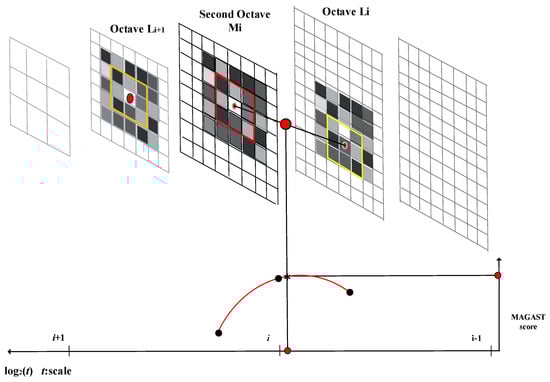 To identify the most stable point, i.e., the minimum or maximum point, in a scale space, each sampling pixel point is compared with its neighboring pixel points to determine whether it is larger or smaller than the neighboring points in its spatial domain. After the two-octave capturing technique is employed to construct an image pyramid, each image in the pyramid is tested using the MAGAST corner detection method to determine the candidate regions. Subsequently, the non-maximum suppression is applied to the 3 × 3 cubic region formed by the spatial domain and neighboring scales of each candidate region to determine the stable feature point in this region. Figure 6 illustrates this multiscale feature detection scheme. Each extremum point localization process involves using the first-octave and second-octave images as the judgement and reference layers, respectively. A 3 × 3 cubic region is defined around each sampling point (feature) in the candidate regions of the second-octave image. The upper and lower layers of the cubic region are equivalent to the upper and lower layers of the first-octave image (Li and Li+1). Subsequently, a cross-reference search method is applied to determine the coordinates and scale of the extremum point. After the extremum point in the first second-octave image is identified, the next second-octave image is used as the reference layer. Accordingly, Li+1 and Li+2 are used as the upper and lower layers of the 3 × 3 cubic region, respectively, and so on. For example, for image Mi, the candidate features and its eight neighboring pixel points are selected, the red block and their MAGAST response values are compared. In addition, the MAGAST response value of the candidate feature is also compared with those of the nine pixels in the neighboring first-octave upper layer (Li) as the yellow block and those of the nine pixels in the neighboring first-octave lower layer (Li+1) as the orange block. This enables the determination of whether the candidate feature contains the extremum value of the local MAGAST response value. After the non-maximum suppression, a parabolic function is fitted in the scale and image spaces. The maximum point of this function corresponds to the accurate scale of the feature. Finally, a quadratic interpolation method is used to determine the exact location of the feature point. In other words, the four neighboring pixels are employed as the subpixels. The coordinates of the subpixels are adjusted to determine the accurate location of the maximum or minimum point.