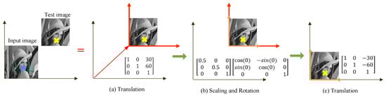 where and represent the coordinates of the image center; and indicate the scale factor and angle of rotation, respectively. More details for the parameter will be presented in Section 2.5.2. Next, matrices in (9) are multiplied to obtain (10).