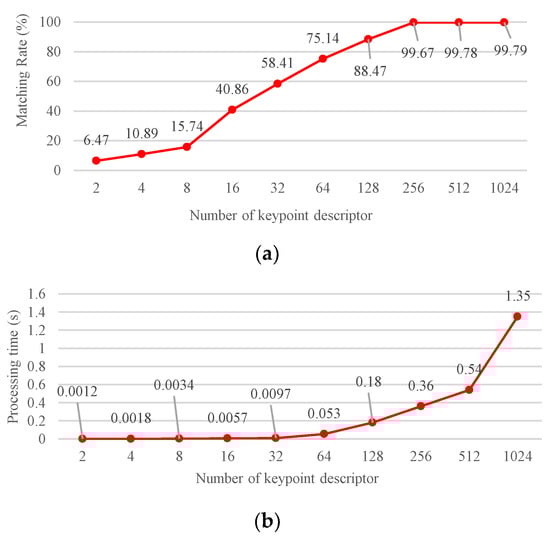 Performance comparison between (a) matching rate and (b) processing time with various numbers of keypoint descriptors.
