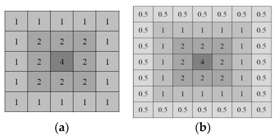 Gaussian weighting templates. (a) 5 × 5 and (b) 7 × 7.