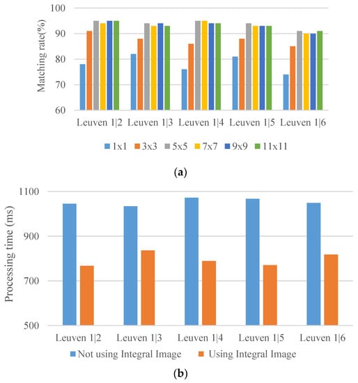 Matching rate and calculation time comparison between with and without the use of integral image. (a) Matching rate achieved through Gaussian weighting templates of various sizes; (b) Calculation time required for the Gaussian weighting templates when the integral image is applied.