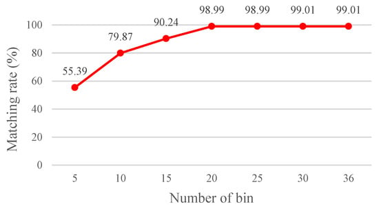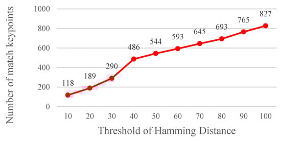 A Hamming distance <, which was used as the basis for matching feature points, was determined through an experiment. Using the procedure mentioned in Section 2.1.1, it shows that the optimum lower bound and upper bound parameters can be obtained. The results show that the matching rate is the highest when the Hamming distance threshold value is set at 40 (Figure 13). A high Hamming distance threshold indicates a high tolerance value. Moreover, the threshold value is directly correlated with the number of matched images (Figure 14). Yet, more matched feature points do not imply a desired matching outcome since the matched feature points might be unstable, indicating that a high tolerance value is associated with a high probability of erroneous feature point matching.