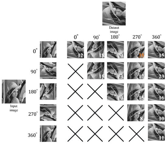 Table 4 illustrates the voting lookup table mechanism. This table records the voting results of comparing the 40 input features with the database features under various rotation angles. The accumulated matching outcome set is denoted as , where represents the accumulated matching outcome when the rotation angle for the input image and database image with a rotation angle, respectively. The results show that the highest vote count occurs when the angles of the input and database images are set at 0° and 270°, respectively, indicating that the input and database images are highly correlated. Subsequently, all of the input feature vectors are compared to the database feature vectors with a 270° rotation. In Table 4, the mark “X” indicates repeated angle calculations, which are omitted. In addition, a graphical example is used to illustrate the aforementioned procedure as shown in Figure 16. As a result, when an input image at 0° and the database image at 270°, it receives the highest vote count in the voting lookup table. However, if the highest vote count is lower than a specific threshold value, the input and database images are not correlated. Thus, the subsequent comparison is omitted as: