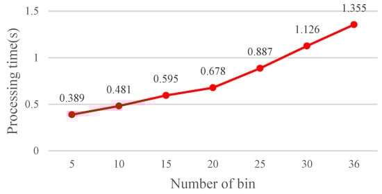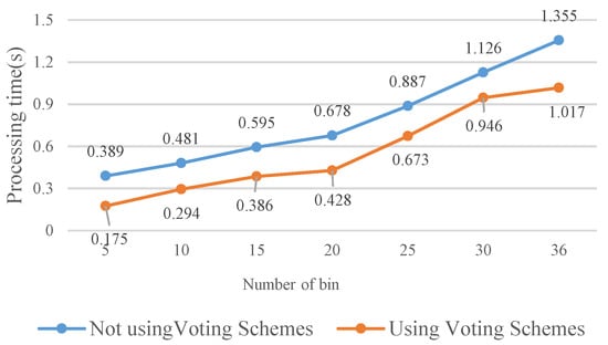 The results show that the matching rate is proportional to the number of rotations; yet, the computation time also increases. Specifically, when the number of rotations is 20 (18°/rotation), the matching rate is 98.99%. Although the matching rate further increases to 99.01% as the number of rotations is 30 or 36, the processing time increases as well. To achieve balanced performance, this study configures the number of rotations at 20. If the FBRLF is not integrated with the voting mechanism and lookup table method, then the efficiency of the overall calculation is severely reduced. For example, a feature vector with a length of 256 requires 38,400,000 (100 × 100 × 256 × 15) comparison calculations (100 input images, 100 database images, 256 sets of data in the feature vector, and 15 rotation angle combinations). However, applying the voting mechanism and lookup table method only requires 17,920,000 (40 × 100 × 256 ×15 + 100 × 100 × 256) comparison calculations. Specifically, the 40 features are adopted to apply the voting mechanism. Subsequently, if the highest vote count exceeds the threshold vote count, the corresponding rotation angle combination is used to again compare all input features with the database features. Figure 19 illustrates the calculation time of the FBRLF integrated with the voting mechanism and lookup table method. The results revealed that after this method was integrated, the time complexity of the FBRLF calculation was markedly reduced, indicating that the proposed voting mechanism can effectively reduce the search time and the overall system efficiency.