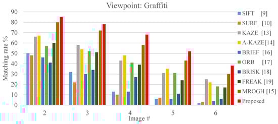 The results revealed that when view-angle variation is small, the floating-point descriptors, SIFT and SURF, resulted in matching rates greater than 40%, and the KAZE, A-KAZE and MROGH achieve matching rate greater than 70% as it can be seen in Figure 20. Among the algorithms that apply the binary matching scheme, the effect of the FBRLF is more favorable than that of the ORB, BRIEF, FREAK, and BRISK. When view-angle variation increases, the matching rate of all algorithms decreases. Because the FBRLF can fixate the rotation angle and stimulate affine features, its matching rate is more favorable than that of the MROGH under view-angle variation.