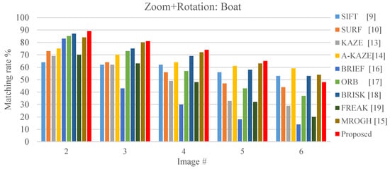 Under small scaling and rotation variation, the SIFT, SURF, and KAZE achieve matching rates greater than 60%. However, the matching rate decreases with increasing scaling and rotation variation. The proposed FBRLF can detect stable features in scale space and applied affine feature matrices; thus, the proposed algorithm exhibited superior scaling-invariant and rotation-invariant capabilities than did other algorithms as it can be seen in Figure 21.