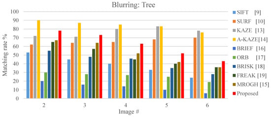 Under blurring variation, the KAZE and A-KAZE achieve matching rates greater than 70% as it can be seen from Figure 22. Among the algorithms that apply the binary matching scheme, the FBRLF is more desirable than that of the ORB, BRIEF, FREAK and BRISK. Although the feature details are lost when the testing images became blurry, the FBRLF algorithm can exhibit a higher matching rate than do the other binary match algorithms because it can identify more stable feature points.