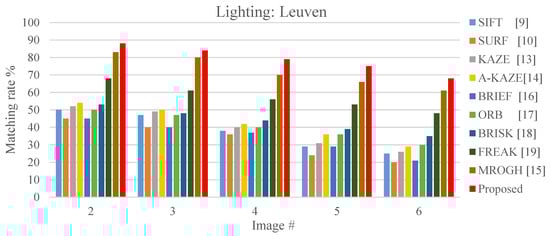 Lighting variation refers to how the details of an object are gradually lost as it is photographed under various lighting conditions. Variation in lighting can enhance certain features in an image, while weakening other features. As it can be seen from Figure 23, the FBRIEF method can exhibit a favorable lighting-invariant capability compared to other algorithms.