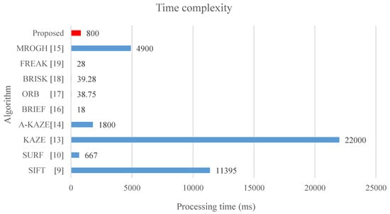 In this study, processing time refers to the time required for extracting, describing, and matching stable features among images. Moreover, the computation time is calculated with images of size 800 × 600, which are from [34], in which approximately 1500 keypoints are detected per image and the results correspond to the description and matching of all the keypoints. The results show that the BRIEF exhibits the shortest processing time among all the algorithms as it can be seen from Figure 24, because it only involves comparing the coordinates of the feature points, which are not scale-invariant and rotation-invariant. The ORB adopts the exhaustive method to identify correlated random points, and the BRISK applies various Gaussian core models to effectively control image noise; thus, these two methods also incur additional processing time. Otherwise, the FREAK proposes to apply the saccadic search by parsing their descriptors in the matching process, and thus it decreases the matching time. Although the methods with binary descriptors can achieve processing time shorter than 40 milliseconds, the matching performance is inferior to other binary descriptor methods such as MROGH and FBRLF. The SIFT and SURF have high time complexity because they generate linear Gaussian blur pyramids. However, the SURF adopted integral images to resolve problems on the pyramids and feature vectors, and thus effectively reduces the time complexity. The KAZE and A-KAZE exhibit excessively high complexity because they involve nonlinear image pyramids computation. Moreover, the MROGH provides good quality descriptors, but it is still with long computation time. In contrast, the proposed FBRLF algorithm exhibits not only scale-invariant, rotation-invariant, view-angle-invariant, and lighting-invariant capabilities, but also yields high computational efficiency.