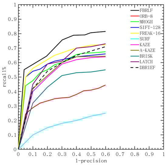 As illustrated in Figure 25, the proposed FBRLF algorithm performs the best in all types of the Oxford data set, such as Graffiti, Boat, Wall and so on. Notably, the FREAK, BRIEF, ORB and BRISK are faster than the proposed FBRLF, but the proposed FBRLF can achieve the highest precision-recall curve than that of those methods. The proposed FBRLF also can achieve better performance than the descriptor learning methods, including LATCH and DBRIEF. In addition, although FBRLF is slower than that of the ORB and FREAK in the description phase, the FBRLF can obtain the best precision-recall curve than those methods as it can be seen from Table 6. The FBRLF method has utilized rotation-invariant features by fixating feature point rotation at various angles, and consequently leaded slightly increasing matching time than that of the ORB. Meanwhile, the FBRLF method requires the lowest storage requirement as that of the ORB. Finally, the proposed FBRLF method not only demonstrates good precision-recall performance, but also efficient on computation and storage.