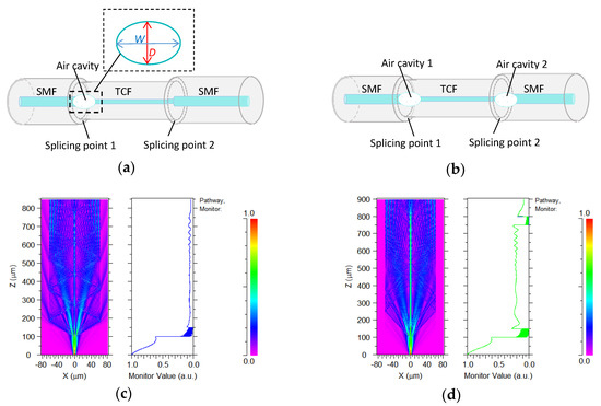 In our experiments, the schematic diagrams of the RI sensors are shown in Figure 1, in which a section of thin-core fiber (TCF) is spliced between two single mode optical fibers (SMF) to compose a SMF-TCF-SMF (STS) structure, and one or two air cavities are embedded in the optical fiber cladding at splicing points between the SMF and TCF, as shown in Figure 1a,b, respectively. Figure 1c illustrates the simulation of the light propagation within a single-cavity sensor. The length of the cavity is indicated by W, and the longitudinal diameter of the cavity is denoted by D. From Figure 1c, it can be found that the light injects into the input-SMF and then interferes in the air cavity. After the cavity, lots of cladding modes are stimulated due to the core to core mismatch at the first splicing point, which is produced by the air cavity. As evanescent fields, cladding modes can carry the refractive index information of the surrounding materials. At the second splicing point between the TCF and SMF, these cladding modes can be partly returned to the fiber core and induce interference with the core modes. In Figure 1c, the interference light in the core of the output SMF can be observed obviously. Therefore, the surrounding RI can be obtained by measuring the interference spectrum of the sensor. Based on this operating principle, this sensor can be seen as an in-fiber Mach-Zehnder (M-Z) interferometer and its output spectrum expression can be written as [1]