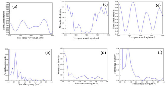 This output spectrum is composed of core and cladding modes themselves, and their mutual interference. In order to stimulate higher-order cladding modes with a lower effective RI, an air cavity is embedded in the optical cladding of the in-fiber sensor. The difference of the optical field in the thin core fiber of Figure 1c,d is mainly due to the large optical power loss of the two cavity sensor, which can be found from the comparison of the monitor power values of these two figures. In our simulation, the RI of the core and cladding of the SMF with 1.4544 and 1.45 and TCF with 1.4641 and 1.45 are adopted, respectively. The diameter ratio of core/cladding of SMF with 8 μm/125 μm and TCF with 5 μm/125 μm, respectively. By using the finite difference beam propagation method, the interference spectra of the different sensors of cavity-free (shown as Figure 2a) and one air-cavity with cavity size of W = 100 μm, D = 8.4 μm (shown as Figure 2c) and W = 20 μm, D = 80 μm (shown as Figure 2e) are simulated. Their spatial frequency spectra, which is expanded according to (), can be obtained through a Fourier transform of their interference spectra, which are shown in Figure 2b,d,f. The effective refractive index of the dominant cladding modes can be obtained through analyzing its spatial frequency spectrum. The high spatial frequency of the high order cladding mode corresponds to the low effective refractive index. By comparing Figure 2b,d, it can be found that the higher order cladding mode can be introduced through the inner air cavity of the core. The simulation results show that the cladding mode expands to a higher order with the length of the cavity increasing, but the increase of cavity length also leads to a greater loss and deterioration of the interference spectrum, which is shown as Figure 2c,d. Through simulation, we also find that some higher cladding modes can be further introduced by enlarging the air cavity diameter, which not only reduces the loss of optical power, but also optimizes the spectrum of the sensor, which is shown as Figure 2e,f.