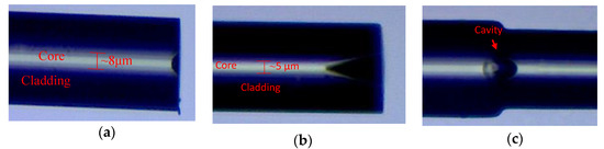 The microcavity in the fiber core is fabricated by the hydrofluoric acid etching method [16,17]. Due to the corrosion rate of Germanium doped fiber core being higher than that of fused quartz cladding, a micron-sized cavity can be obtained inner the core as corroding the cleaved fiber end for a period of time, and the size of the microcavity can be designed through controlling the corrosion time. The microscopic photos of the cavity are illustrated in Figure 3. In our experiments, two of the same open microcavities are fabricated in the cores of an SMF and a TCF fiber tip, respectively, which is shown in Figure 3a,b. Then, these two fibers are spliced face to face by a fusion splicer with a weak discharge intensity mode. The microscopic photo of the final embedded fiber microcavity is shown in Figure 3c. Due to the rapid hot melting and cooling of the silica fiber core, with the thermal expansion of air in the cavity, the result is the formation of a smooth surface of an ellipsoidal microcavity. In these sensors, the thin core fiber (TCF) is inserted in the middle of the sensing structure, which can effectively improve the stability of the sensor due to its bending insensitive performance. In the one-cavity M-Z sensor, the length of the TCF is closely related to the spectrum and sensitivity of the sensor [1,18,19]; therefore, this needs to be taken into consideration in the fabrication of the sensor. In our experiment, the TCF length is 30 mm. In order to further improve the sensitivity of the sensor, graphene film is covered in the interior cavity. The graphene is single-layered with greater than 99% purity, 0.6-to-1 nm thickness, 0.5-to-5 μm slice diameter, and 1000 to 1217 m2/g specific surface area. The graphene is ultrasonically dispersed in pure dimethylformamide (DMF) solution for several hours and then centrifuged for 5 min in order to remove air bubbles from the solution. Then, the optical fiber tips with a microcavity are immersed in the graphene solution for several minutes. Then, the fiber tips are removed to a temperature-controlled box within 40 °C. Finally, a layer of graphene film is formed on the surface of the microcavity.