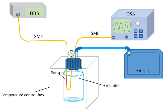 The schematic diagram of the alcohol gas concentration sensing system is set up in Figure 4. Light from a broad band source (BBS) injects into the sensor from its one-end spliced SMF, and the transmission spectrum of the sensor is sent to an optical spectrum analyzer (OSA) from a spliced SMF at another end. The sensor is placed in an alcoholic gas bottle, which is placed in a 40 °C temperature control box. In order to ensure that the air pressure in the bottle is the same with as the surrounding atmosphere, the bottle is tubed to an exhausted large-volume empty soft bag.