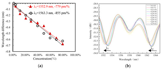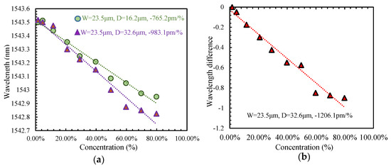 In our experiment, the concentration of the alcohol gas is increased from 1% to 80%, with which the dip wavelength of the senor (with W = 23.5 and D = 16.2 cavity size) interference spectrum presents a blue-shift. The linear fitting curves of the experimental results and superposition spectrum of the sensor corresponding to different alcohol gas concentrations are shown in Figure 5a,b, respectively. In order to compare the sensitivity between different dip wavelengths of the sensor, a wavelength difference between the sensing wavelength and its initial wavelength is adopted, which is shown in Figure 5a. From their linear fitting curves, it can be found that according two different dip wavelengths, their sensitivities of wavelength difference versus gas concentration are pm/% and pm/%, respectively; and the longer wavelength assumes a higher sensitivity, primarily because the longer wavelength corresponds to the higher order cladding mode with a larger mode field area.