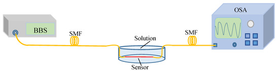 A low concentration solution RI within 1.33 to 1.38 range sensing characteristics of the single-cavity, graphene-filled cavity and double-cavity sensors are also experimentally demonstrated. The experimental setup is shown in Figure 7. The broad band light emits from the BBS and injects into the sensor through the SMF; the sensor is immersed in the solution, and an OSA with 0.02 nm resolution is used to observe the transmission spectrum of the sensor.