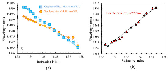 Linear fitting curves of single-cavity and graphene filled single-cavity sensor are shown in Figure 8a. From this figure, it can be found that dip wavelengths assume a blue shift with the RI increasing from 1.33 to 1.38, and the sensors have pm/RIU sensitivity in the single-cavity sensor and pm/RIU sensitivity in the graphene filled single-cavity sensor, respectively. The linear fitting curve of the double-cavity sensor is shown in Figure 8b, from which it can be found that the dip wavelength is red-shifted with the RI increase with 359,770 pm/RIU sensitivity corresponding to a RI resolution.