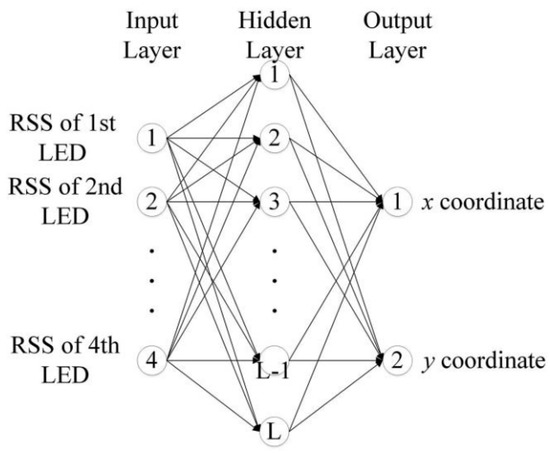 We set the received signal strength from LED 1, LED 2, LED 3, LED 4 as the input of the neural network and it can be expressed by where in this paper. The number of hidden layer nodes and output layer nodes are denoted as and , respectively. In this paper, the value of is 2. The output of the neural network is the position of the detector and is expressed as ; is the weight between the input layer and hidden layer and the threshold is . is the weight between the hidden layer and output layer and the threshold is . Then we have the output of the hidden layer [22]: