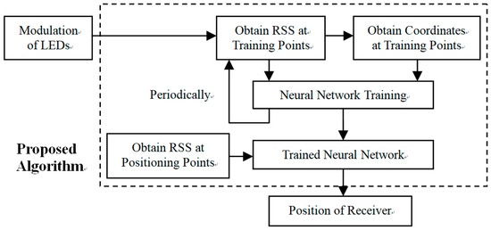 Our ANN functions through two stages. In the training stage, the network is trained by the RSS values of a chosen set of training points in the positioning area. The total squared error between desired coordinates and the actual output of the network is optimized by the MMBP algorithm. If the training is completed, the neural network enters the testing stage. During this process, the input of the neural network is the position of the test points, and then the coordinates of test points can be calculated by the neural network. The flow chart of the ANN-based VLP algorithm is shown in Figure 3.