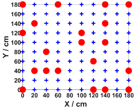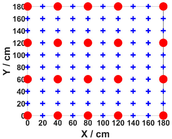 In our experiment, 100 test points (blue points) are evenly placed in the positioning area with a density of 20 cm × 20 cm. Twenty points (red points) are selected as the training set, and all 100 test points are positioned in the validation stage. We perform measurements five times at each training data point (red point) to reduce the influence of light intensity fluctuation on the positioning error and save them as the training data set. In order to verify the adaptability of the proposed algorithm, we use two different training data sets: arbitrary set and even set.