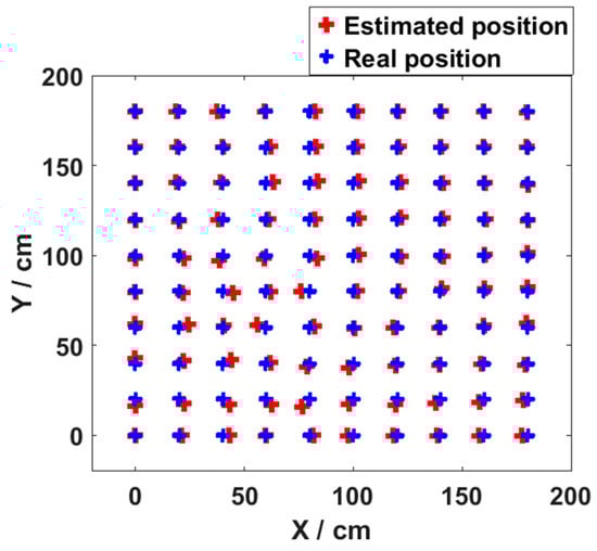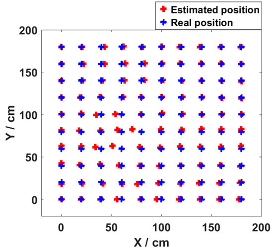Meanwhile, in Figure 6, the maximum positioning error observed with different number of nodes is only 3.35 cm. This demonstrates the high positioning accuracy of the MMBP algorithm. The 2D positioning results in the validation stage at all 100 points are shown in Figure 7. It verifies that after being trained with only 20 points, the neural network is able to perform accurately for all other points in the positioning area, and the average positioning error is 1.99 cm.