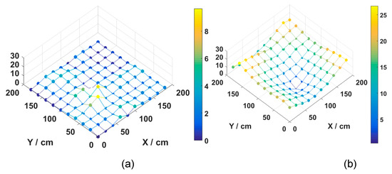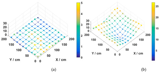 In Figure 17, we can find that the maximum positioning error is obviously different when the neural network is trained by different training data sets. The maximum positioning error for the arbitrary set is only 5 cm while that for the even set is 9.64 cm. The distribution area of points with maximum positioning errors using the two different training methods is almost the same. The positioning accuracy of Figure 7 and Figure 13 in the center area is lower than that of the outer edges. This is mainly due to fluctuations of the light intensity in this red region being noticeably larger. In fact, the fluctuation of the LEDs’ illumination is not consistent and will lead to an increase in positioning errors, according to the [23]. The maximum positioning error for the arbitrary training data set is obviously lower due to more training points in the area.