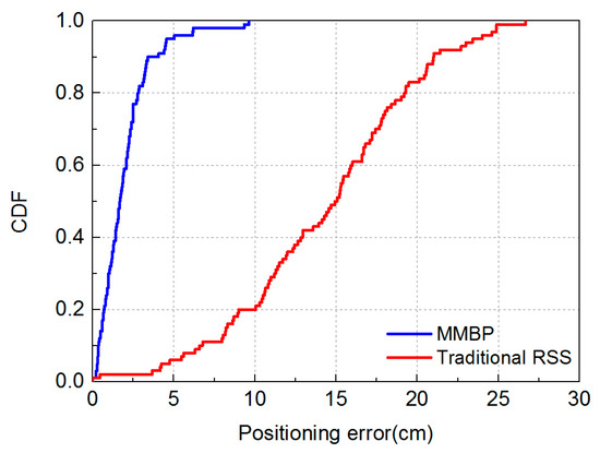 The distribution of positioning error of MMBP algorithm and the traditional RSS-based algorithm are shown in Figure 14a,b. The maximum positioning error is 5 cm, which is just half as that obtained with the even training data set. In addition, the distribution of positioning errors with the even training data set is different from that of the arbitrary set due to different distributions of training points. The corresponding cumulative distribution function (CDF) of positioning errors is presented in Figure 15.