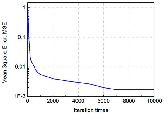 We evaluate the effectiveness of MMBP by comparing its performance with the traditional RSS-based algorithm. The distribution of positioning error of MMBP and traditional RSS-based algorithm are shown in Figure 8a,b. The corresponding cumulative distribution function (CDF) of positioning errors is presented in Figure 9. Results indicate that the performance of MMBP is much better than the traditional algorithm, where the average estimation error is significantly lowered by more than one magnitude from 14.34 cm to 1.99 cm. The accuracy along the x-axis is improved from 10.14 cm to 1.49 cm while that along the y-axis is improved from 8.55 cm to 0.83 cm. Figure 9 shows that the maximum positioning error for the traditional RSS algorithm is 26.66 cm and the error of 80% confidence is 19.31 cm. In comparison, with the MMBP algorithm, the largest positioning error is successfully kept within 10 cm (9.64 cm), and the error of 80% confidence is reduced to 2.77 cm. The average positioning accuracy of the MMBP algorithm is 7.2 times higher than the traditional RSS algorithm. The MSE of the MMBP with the even training data set is shown in Figure 10. Although the MSE declined rapidly, we can see that the mean square error reaches the minimum value after 8000 iterations. In addition, in Table 3, the positioning time of traditional RSS-based algorithm is 2.25 s, while the positioning time of our proposed algorithm is only 0.007s and the training time is 2.36 s (CPU: AMD FX-6300). The comparison results prove that the proposed algorithm can achieve high-precision and real-time positioning.